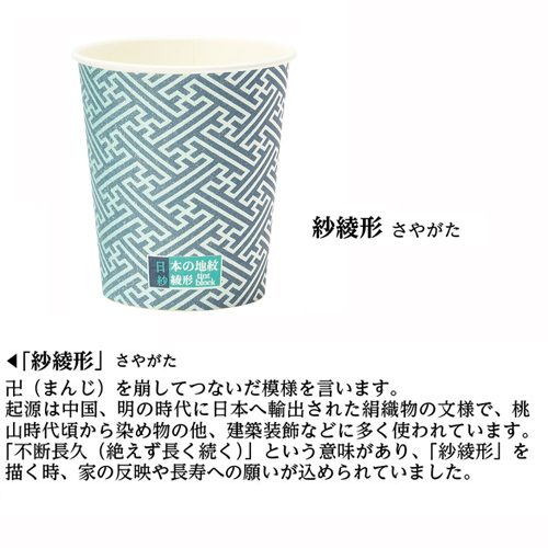 日本人にとって馴染み深い「沙綾形」「青海波」「麻の葉」の3種の地紋をカップにデザインしました。落ち着いた粋なデザインはおもてなしにも、普段使いにもおすすめです。和風の演出にはもちろん、北欧柄にも通じるモダンさで、場所や人、時を選ばず、皆様にお使いいただけるベーシックデザインカップです。