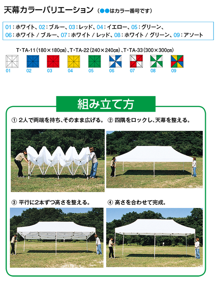 2人で簡単に設営でき、様々なイベントに対応できる5色のカラー・バリエーション・アソートから用途に合わせてご自由にお選び頂けイベント等を盛り上げます。付属品:ロープ4本・ペグ(各足の本数分)・フレーム収納袋・天幕収納袋