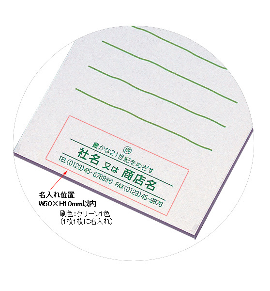 ●名入れカラー:緑1色(表紙:黒1色)●サイズ:W70mm×D2mm×H102mm 名入れ寸法ヨコ50mm×タテ10mm以内●包装:個装・透明袋●1ケース800冊入