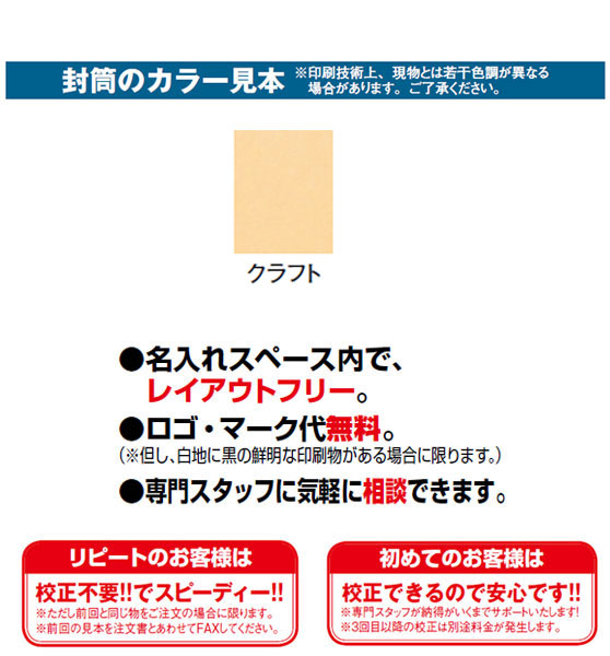 85g クラフト茶 角2 A4サイズやB5サイズ用紙、クリアファイルが折らずに入る角2封筒。契約書送付から法務文書のやり取りまでビジネス上の必需品です。240mm×332mmのサイズで角形2号A4判用書類雑誌用商品で、郵便番号枠無しタイプです。基本名入れの場合は基本名入れ初版代が掛かります。名入れの枠は角丸枠・上下2本線型・枠無し型から選択して頂き、5種の基本書体からお選び頂き、8種の基本カラーからご選択して頂きます。封筒スタンプも3種から選べます。又、実際に印刷の前に、校正でご確認も頂けます。ロゴデータ名入れご希望の場合は、ロゴデータをお送り下さい。その他、お打合せご希望でしたら、印刷センターにご連絡下さい。
