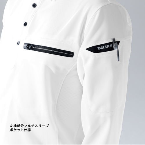 左袖部分マルチスリーブポケット仕様、台衿仕様、TS DESIGNオリジナル4つ穴ボタン、胸ファスナーポケットTS DESIGNオリジナルスライダー、衿パイピング