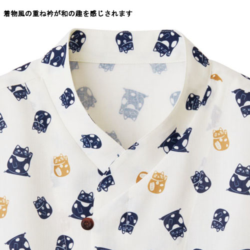 商売繁盛を祈願する縁起のよい和柄プリントシャツが新登場。着る人の心も、お店の雰囲気も盛り上げてくれる1着です。縁起物の象徴でもある招き猫を総柄でプリント。左手を挙げている猫はお客様を招き、右手を挙げている猫はお金を招くとされてます。前比翼開き第一釦ループ留め、左胸アウトポケット、両脇裾スリット、袖口スリット。
