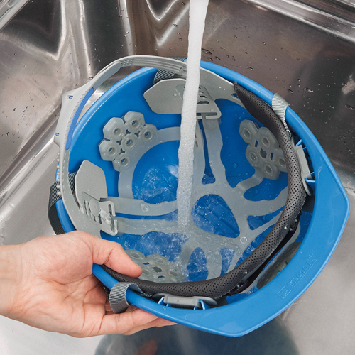 ムレを抑えて快適な通気孔付き。雨だれを防ぐ溝付き構造です。内装には涼しさと安全性を両立した新次元の内装「エアライト」を搭載しています。