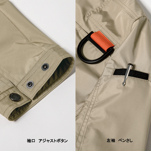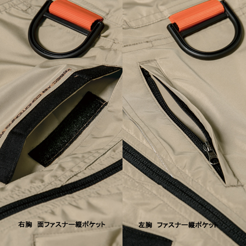 ●袖口アジャストボタン●両胸フックかけDカン付(収納可能)●フルハーネス対応(背中取出し口)●首元調整ひも付き