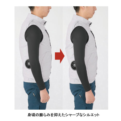 綿100%の感触と風合いはそのままに。綿好きワーカーにおすすめの綿100%空調服™ベスト。人気のベストタイプの空調服™はは太い血管の通っている脇下・首筋を冷やすことでより”涼しい”と感じやすく、しかも動きやすい!特にワークシーンでの空調服™ベストの着用は長袖コンプレッションとのコーディネートがおすすめです。袖がないベストでも右脇にペン差しが付いているので便利です。