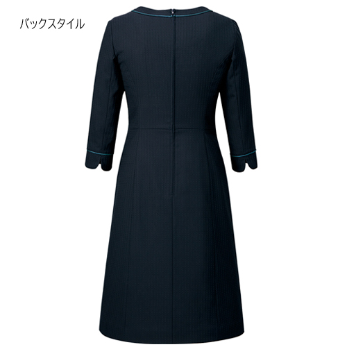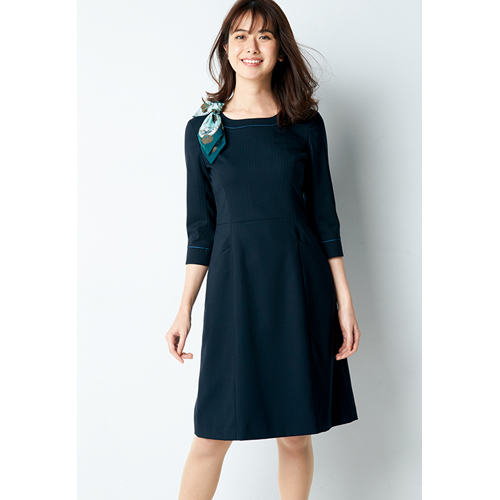 繊細なドットと差し色がオシャレな、オフィスの受付や事務職へ向けた新しいスタイルとしてご提案する七分袖ワンピースです。スクエアネック、七分袖で、彩りのラインが視認性を高めます。シャドーストライプ組織のシャープさにフェミニンなドカラードットをミックス。ウール高混率ならではのリッチな光沢と肌触りです。オールシーズン向け。