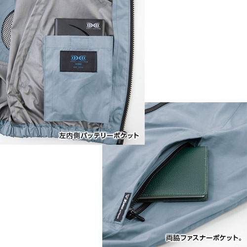 ●両胸フック掛けDカン付●ファン落下防止メッシュ●袖口ドットボタン付●