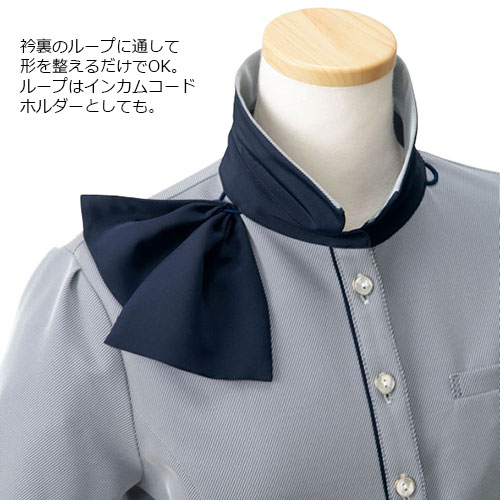 襟元のリボンが取り外し可能。首元がスッキリ見えるスキッパーデザインになっています。リボンを付ければおもてなし感がグンとUP!。襟裏には、リボンが通せるループ付き。リボンはループに通して形を整えるだけで簡単仕様。ループはインカムコードホルダーとしても使用できます。袖は、二の腕がすっぽり隠れる長めの袖がエアコン対策にもなります。折り返せば袖口裏地の濃い色がアクセントに。ボタンは、シルバーの縁取りを施したパール調のボタンで上品な印象。長めの丈なのでパンツスタイルでも合わせやすく、裾をインしてスカートスタイルも。後ろ姿もすっきり美シルエットです。制電性・防汚加工・吸汗速乾素材・透け防止素材の事務服向け商品です。ご希望納期がございましたら、ご指示下さい。返品交換は納品後1週間以内。当サイトで、ジャケット・ワンピース等お取り扱いございます。ご検索下さい。