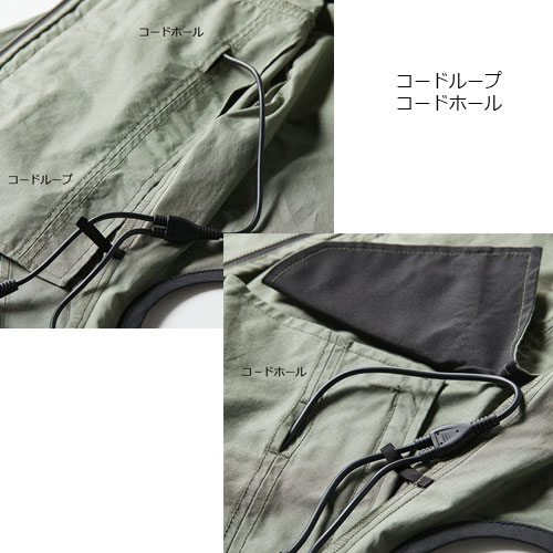 ●両脇ポケット●両胸ポケット●右胸内ファスナー止め・コードホール付バッテリー収納ポケット(特許取得済)●左脇内ドットボタン止めバッテリー収納ポケット●通気エアダクトポケット(特許取得済)