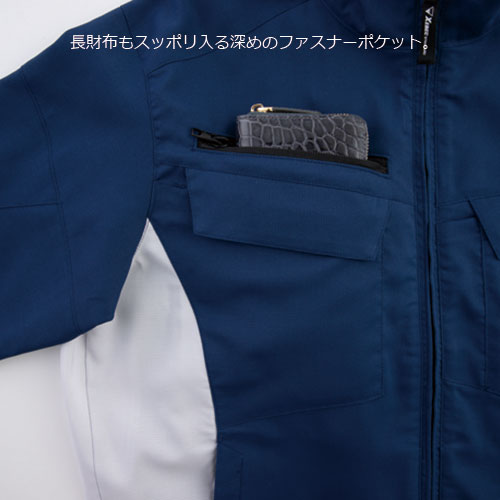 両胸にポケット付き。右胸は小物が落下しないファスナー式のポケットです。