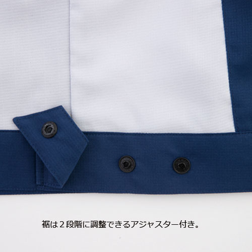 静電気帯電防止作業服のJIS規格に適合した安全性の高いワークウェアとして、半導体などの電子機器を扱う工場や、ガソリンスタンドなどでの事故リスクを抑えます。ストレッチ加工で動きやすさも優れ、裾・袖口は2段階に調整できるアジャスター仕様で作業性を高めます。