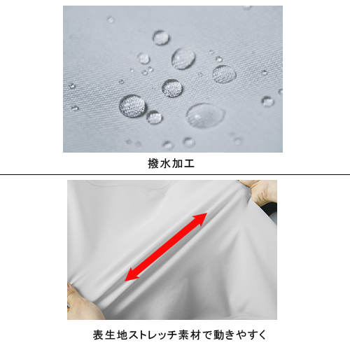 高い防水性に加えて、止水ファスナーや目張りテープで雨水の侵入しにくい仕様。