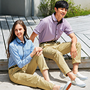 衿や袖口も親しみやすいチェック柄で仕上げ、身だしなみが整った統一感のある美しい印象に。