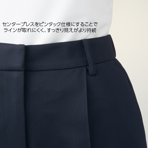 センタープレスをピンタック仕様にすることでラインがとれにくく、すっきり見えがより持続するテーパードパンツ。