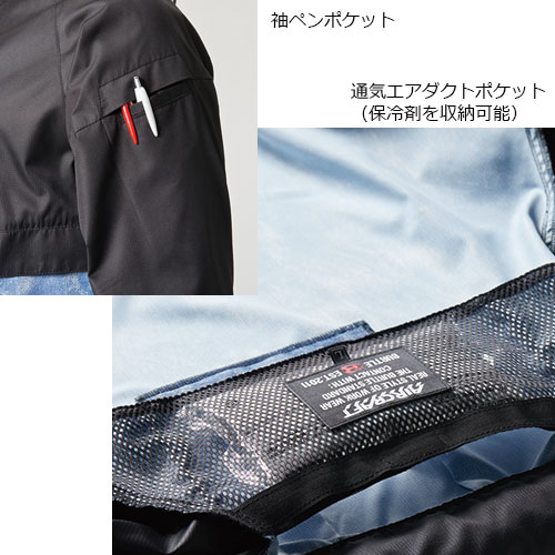 ●両脇ポケット●右胸内ファスナー止め・コードホール付バッテリー収納ポケット(特許取得済)●左脇内ドットボタン止めバッテリー収納ポケット●通気エアダクトポケット(特許取得済)