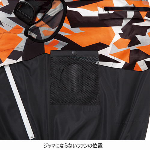 この穴の部分に、扇風機のようなファンを取り付け、専用バッテリーの動力により、ファンから外気を取り入れ、汗を蒸発させることで体の表面の熱を奪い、猛暑の中での作業効率の改善、熱中症対策に効果を発揮するファン付き作業服”です。