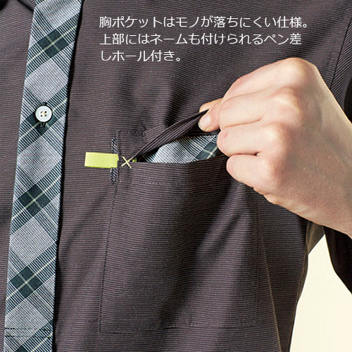 胸ポケットは上部にネームタグが付けられてペン差し付き。