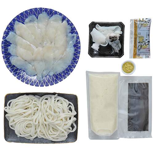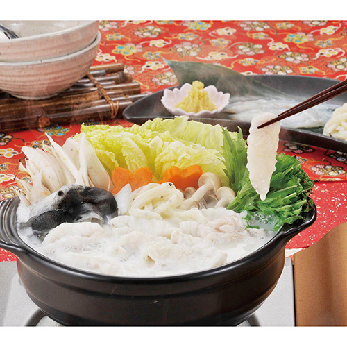 ふく料理宅配のパイオニアで北九州オンリーワン企業『ふく太郎本部』が地元北九州大学と産学連携で共同開発した「とらふぐコラーゲンしゃぶ用皮」は鍋に入れると他では決して味わえないトロ~とした食感。プリプリの身はフグの女王「天然マフグ」を使用し、食べている姿も美しく!骨なしスライスに加工。コラーゲンたっぷりのふく皮を練り込んだ「ふぐべっぴん®うどん」はコシもありしっかりとした歯ごたえ。女性に嬉しい豆乳ベースに生姜を加えた鍋は心も体も温まる絶品のふぐちりです。お好み野菜とご一緒にどうぞ。最後は残ったダシで作るフグのリゾットをお楽しみいただけます。