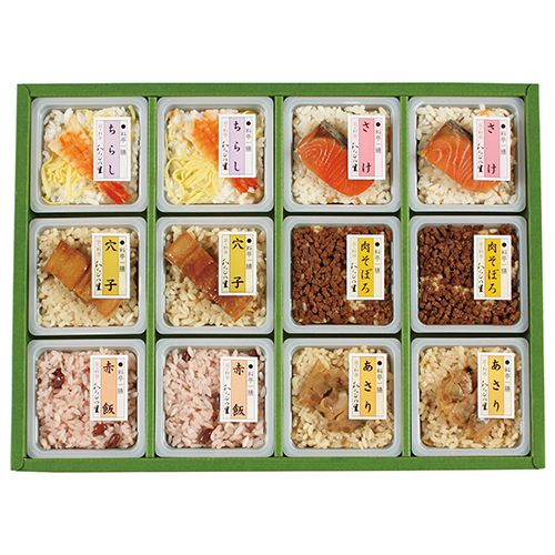 ●箱サイズ:35×25.7×5.5cm●重さ:1500g●内容:鮭ごはん・ちらし寿司・肉そぼろごはん・穴子ごはん・あさりごはん・赤飯 各80g×2●製造生産地:京都府(加工地)●アレルゲン:卵・小麦・えび・さけ・牛肉・大豆・鶏肉・豚肉・ごま