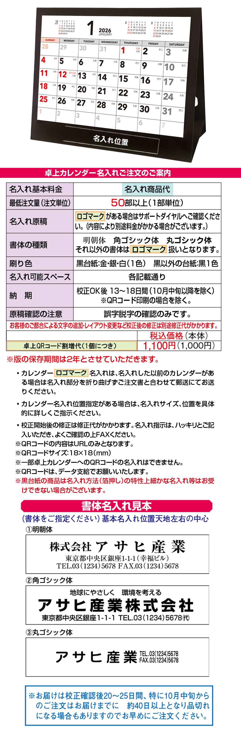 存在感のある大判タイプで6か月先までわかる卓上カレンダー。 諦めるのはまだ早い! 在庫と納期のお問い合わせ大歓迎! 他店で販売終了となってしまったカレンダーの在庫もまずはお問い合わせください! カレンダー通販50年以上の信頼と実績のもと、培った仕入網や強みを生かしてお客様の製品調達をお手伝い致します。