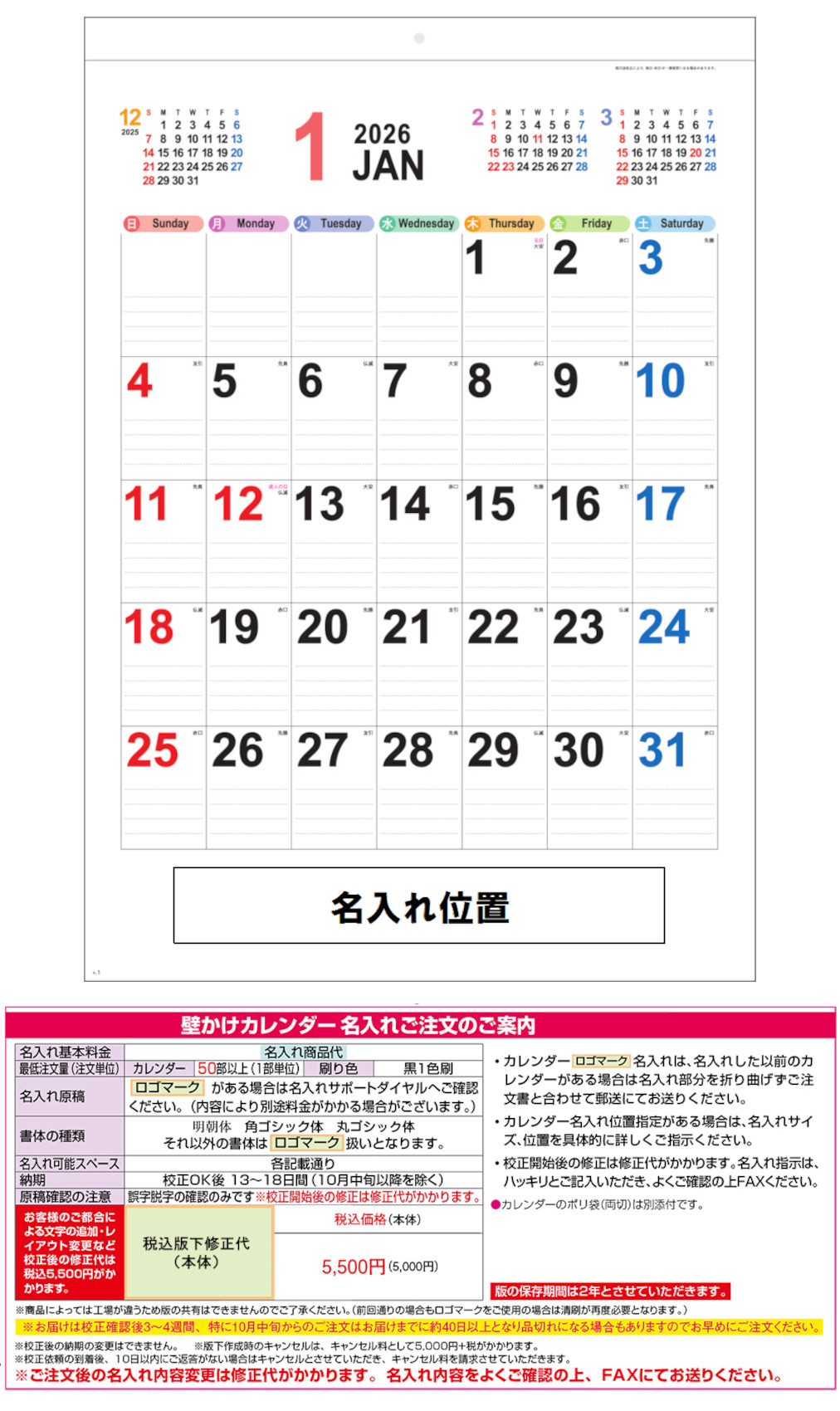 color memo A/2 名入れカレンダーNB-169 FC-401