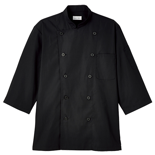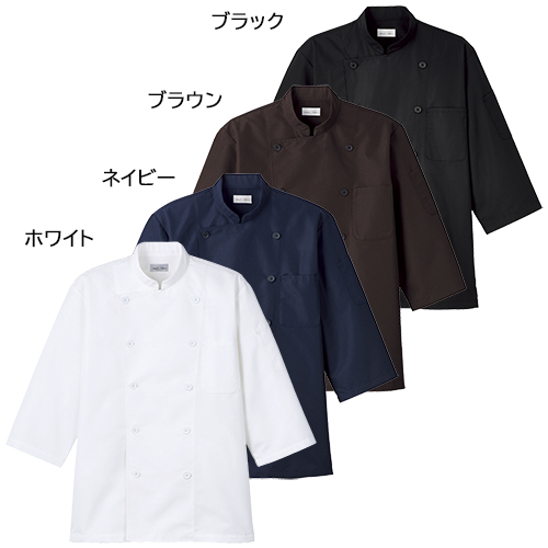 気さくなビストロは守備範囲の広いコックシャツでキッチンからホールまで使える汎用性の高いコックシャツ。< br>すっきりとシャープな印象のスタンドカラー仕様。