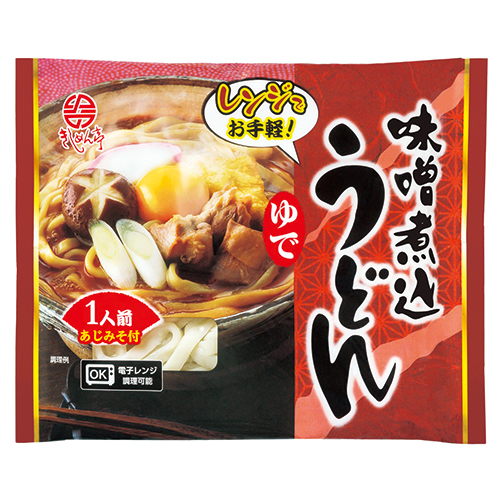 つるつるとのど越しの良い麺を赤みそベースの味みそで煮込むみそ煮込うどんです。レンジでお手軽に調理できます。
