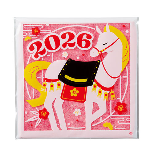 新年のご挨拶にぴったりな年始の定番アイテム。干支の馬イラストが華やぎを添えるパッケージ、実用的で貰ってうれしいハンカチタオルです。