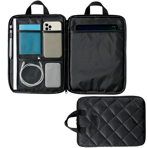 キルティング生地を使用したモバイルバッグ。ポケットがたくさんあるので仕分けに便利。タブレットサイズにも対応しています。