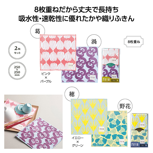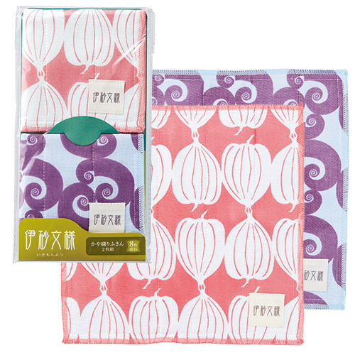 歴史ある京都の伝統柄『伊砂文様』版権商品。8枚のかや織り生地を重ね、強度のあるふきん。使えば使うほど馴染んでいくのが特徴です。