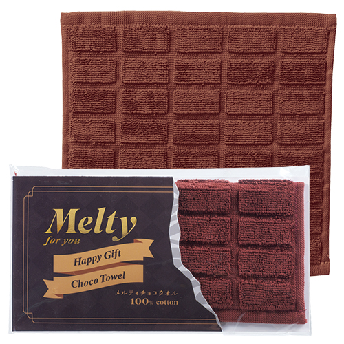 銀紙が破れたような遊び心あるパッケージで、箔押しロゴがきらめき、高級感を演出しています。ユニークで可愛い板チョコ風ハンカチタオルです。