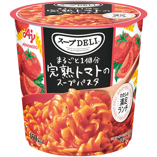 完熟トマトまるごと1個分(小玉約1個分)使用したスープを、くるくるパスタに絡めて楽しめるスープパスタです。