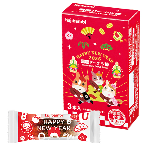 2026年の干支をモチーフにした化粧箱に黒糖ドーナツ棒が3本入っている年末年始の挨拶回りなどに最適なプレゼント品です。