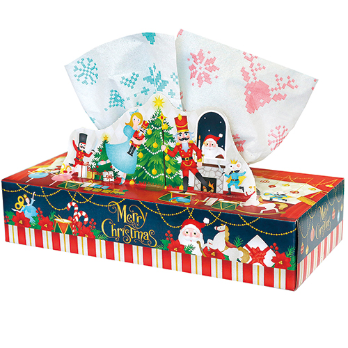赤と緑のプリントティッシュが交互に出てくるサンタクロースのイラストがプリントされたボックスティッシュです。