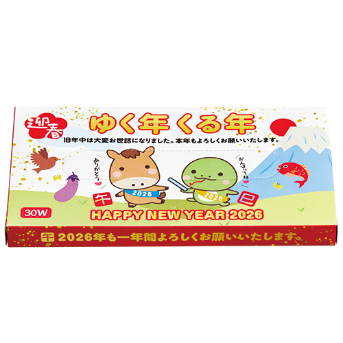 かわいい巳と午のバトンリレーがデザインされたパッケージで、裏面には2026年カレンダーが印刷されており便利です。