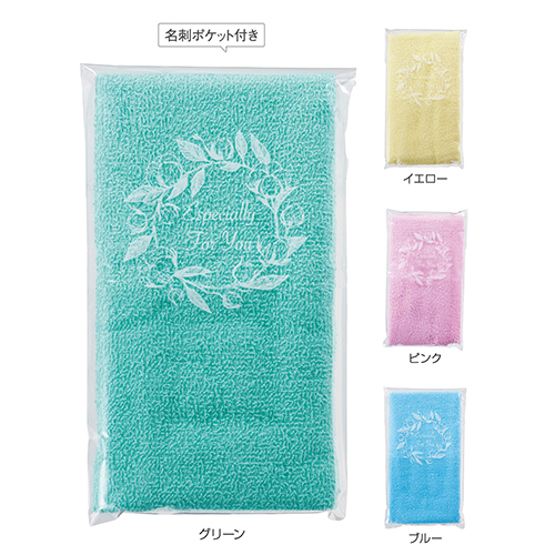 名刺が入れられるポケットの付いたシンプルで使い勝手の良い、彩り鮮やかなカラーフェイスタオルです。