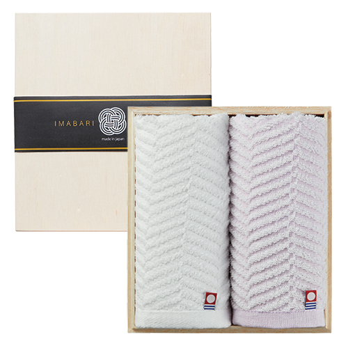 タオルの聖地である今治産の紅白タオルセット。上品なあぜ織りが印象的で、高級感のある木箱入りで贈り物として最適です。