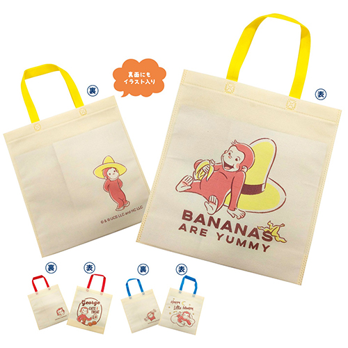 かわいらしい「おさるのジョージ」が印刷された不織布のトートバッグです。裏面にもワンポイントのデザインが入っています。