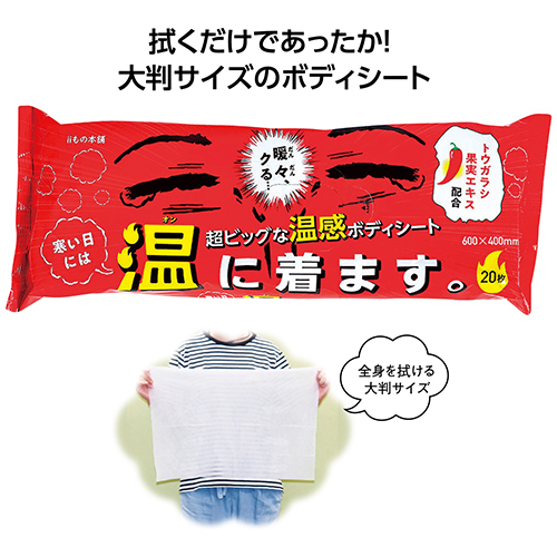 1枚で全身を拭ける60×40㎝の超大判シート。他には無い身体を拭くと後からポカポカしてくる温感ボディーシートです。