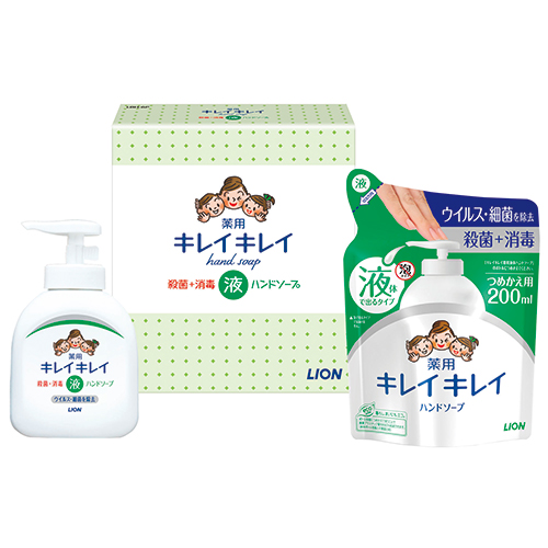 手洗い習慣にかかせない液体ハンドソープキレイキレイの本体と詰替がセットされた化粧箱入りのギフト商品です。