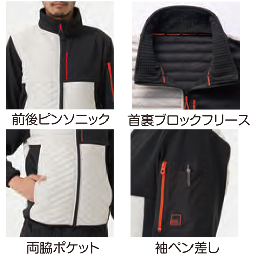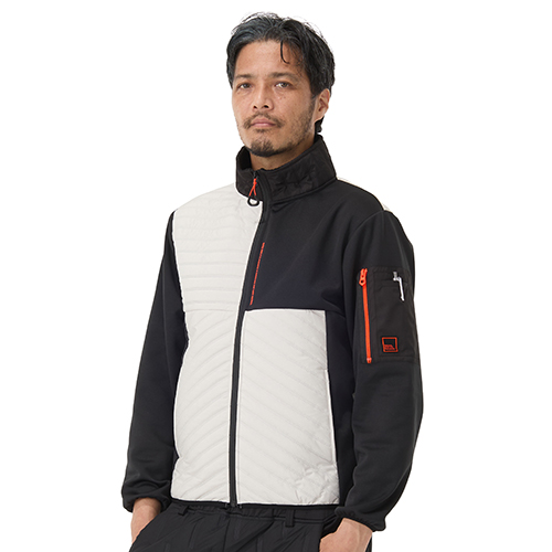 中綿を挟み込んだ防風三層生地×ニット切替で機動力と保温性を両立。