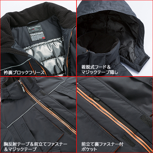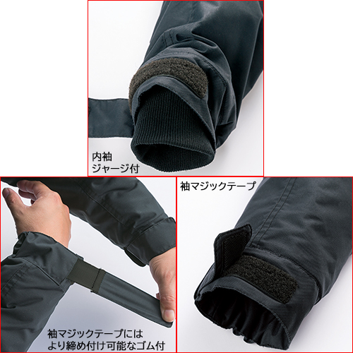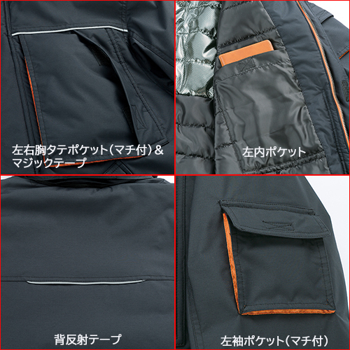 ●両脇ポケット ●左袖ポケット(マチ付) ●左内ポケット ●左右胸タテポケット(マチ付) ●前立裏ファスナー付ポケット