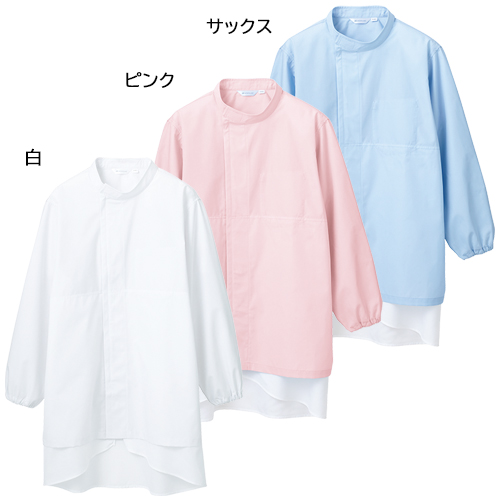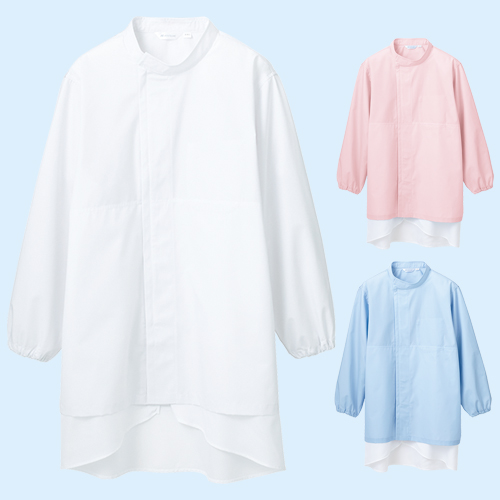 エリアや職域で識別できる3色展開の住商モンブランの工場白衣ブルゾン、抗菌機能を付与、ケープ付帽子の収まりがよく、薄手素材でで異物混入対策効果が高いスタンドカラーのブルゾン。下衣は住商モンブラン7-541、7-599を推奨