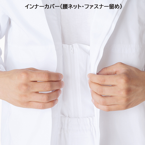 エリアや職域で識別できる3色展開の住商モンブランの工場白衣半袖ブルゾン、抗菌機能を付与、ケープ付帽子の収まりがよく、薄手素材でで異物混入対策効果が高いスタンドカラーのブルゾン。下衣は住商モンブラン7-541、7-599を推奨