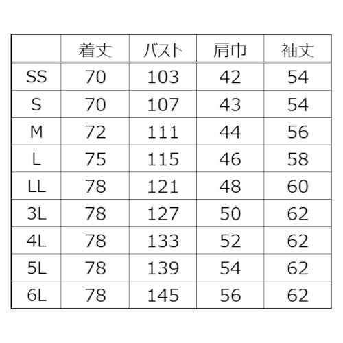 | 白 | SS S M L LL 3L 4L 5L 6L | 1~ | ¥5,478 |