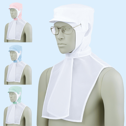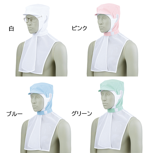 通音声が良い耳メッシュ仕様、オーバーヘッドマスク対応の住商モンブランケープ付き頭巾帽子。抗菌・透け防止・吸汗速乾・制電機能を付与、グリーン購入法対象商品です。