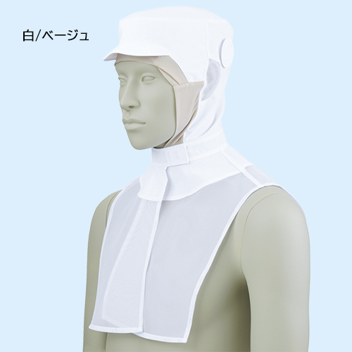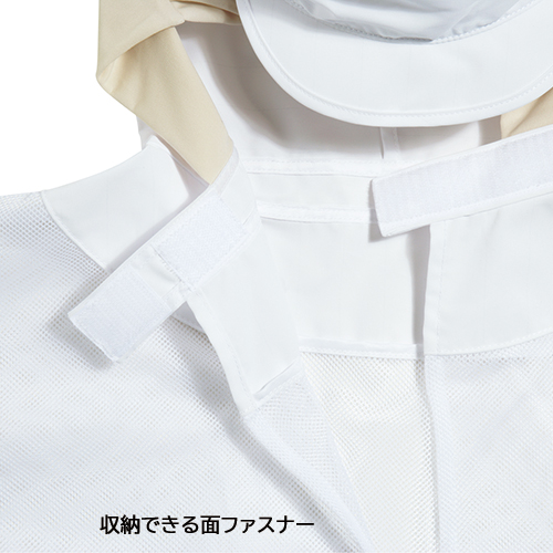 毛羽立ちを防ぐため洗濯時に面ファスナーを折り返せるから長持ち。吸汗速乾に優れ肌との摩擦面が少ない滑らかな肌ざわりと軽い着用感が特徴の住商モンブランのケープ付頭巾帽子。抗菌・透け防止・吸汗速乾・制電機能を付与、グリーン購入法対象商品、異物混入対策もしっかり。