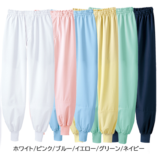 住商モンブランの工場向け白衣パンツ(総ゴムひも付きタイプ)抗菌・透け防止・吸汗速乾・制電機能を付与、グリーン購入法対象商品、薄手の高機能素材で暑い職場に最適な着心地が特徴!