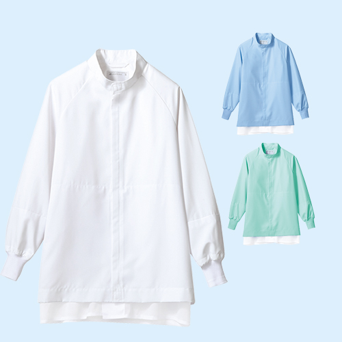 抗菌・透け防止・吸汗速乾・制電機能を付与、グリーン購入法対象商品、薄手の高機能素材で暑い職場に最適な着心地。ブルゾンタイプの住商モンブランの工場白衣ブルゾン。