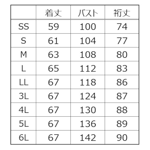 | 白 ブルー グリーン | SS S M L LL 3L 4L 5L 6L | 1~ | ¥3,740 |